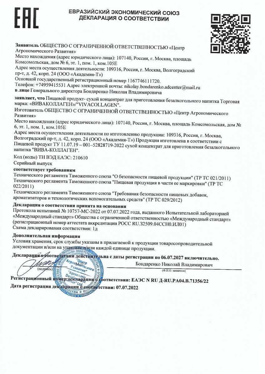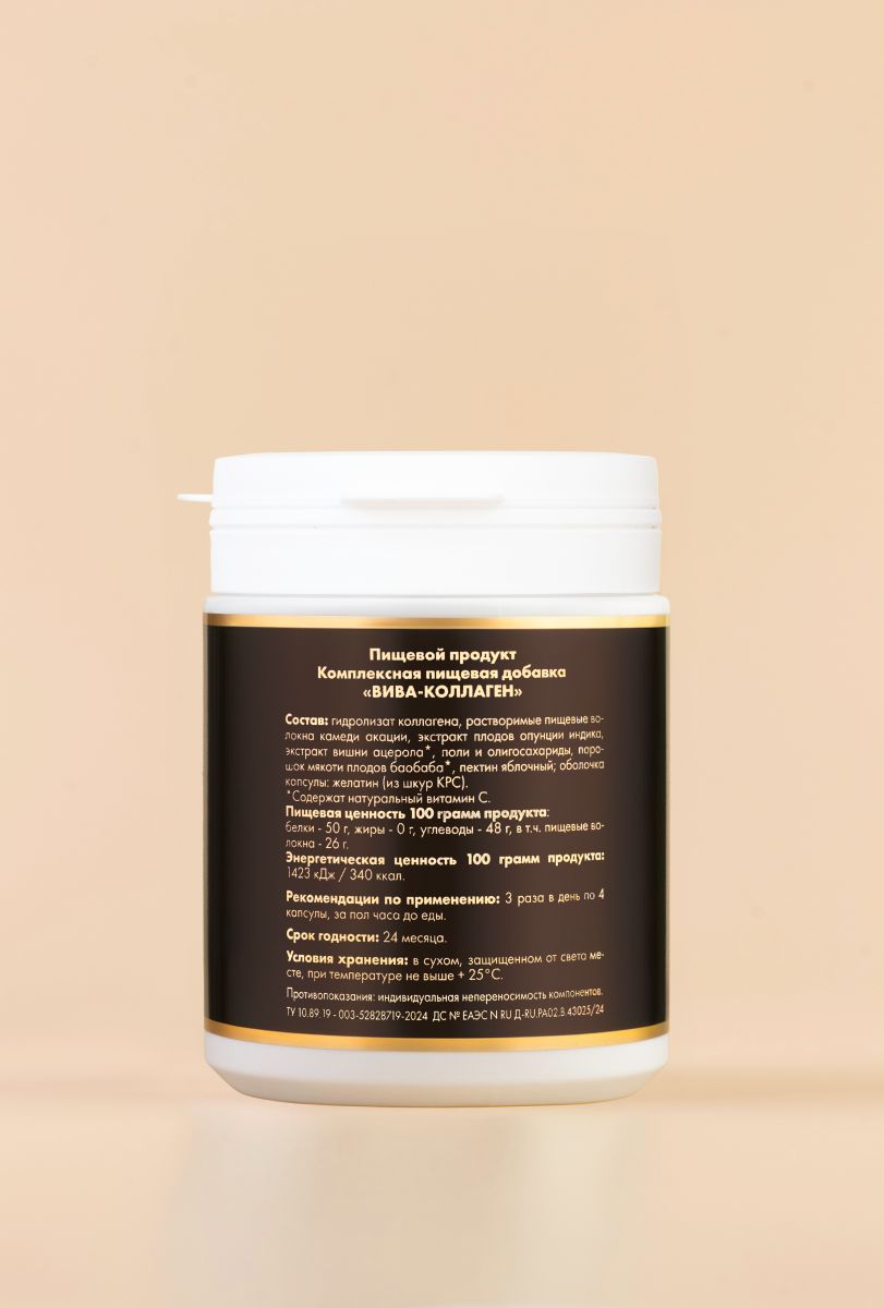 Биопрепарат «VIVA® - COLLAGEN», является природно-сбалансированным, высокоусвояемым ферментативным гидролизатом КОЛЛАГЕНА - основного белка, входящего в состав мышц, хрящей, сухожилий, связок, костей и кожи человека. Это источник свободных биологически активных низкомолекулярных полипептидов и аминокислот. Продукты расщепления физиологичны, легко проникают в клетку, являются аналогами природных продуктов желудочно-кишечного тракта. Коллаген составляет основу суставного хряща и обуславливает его прочность и эластичность.