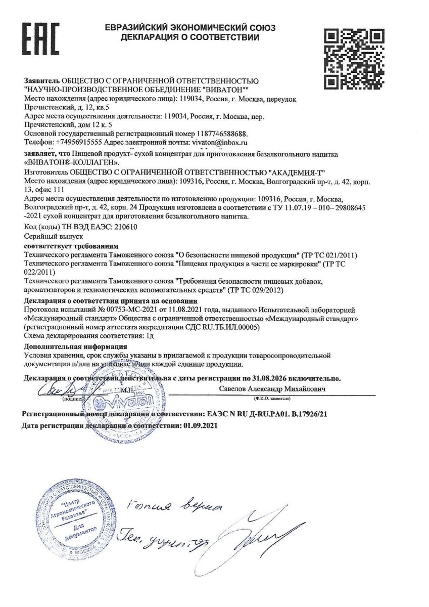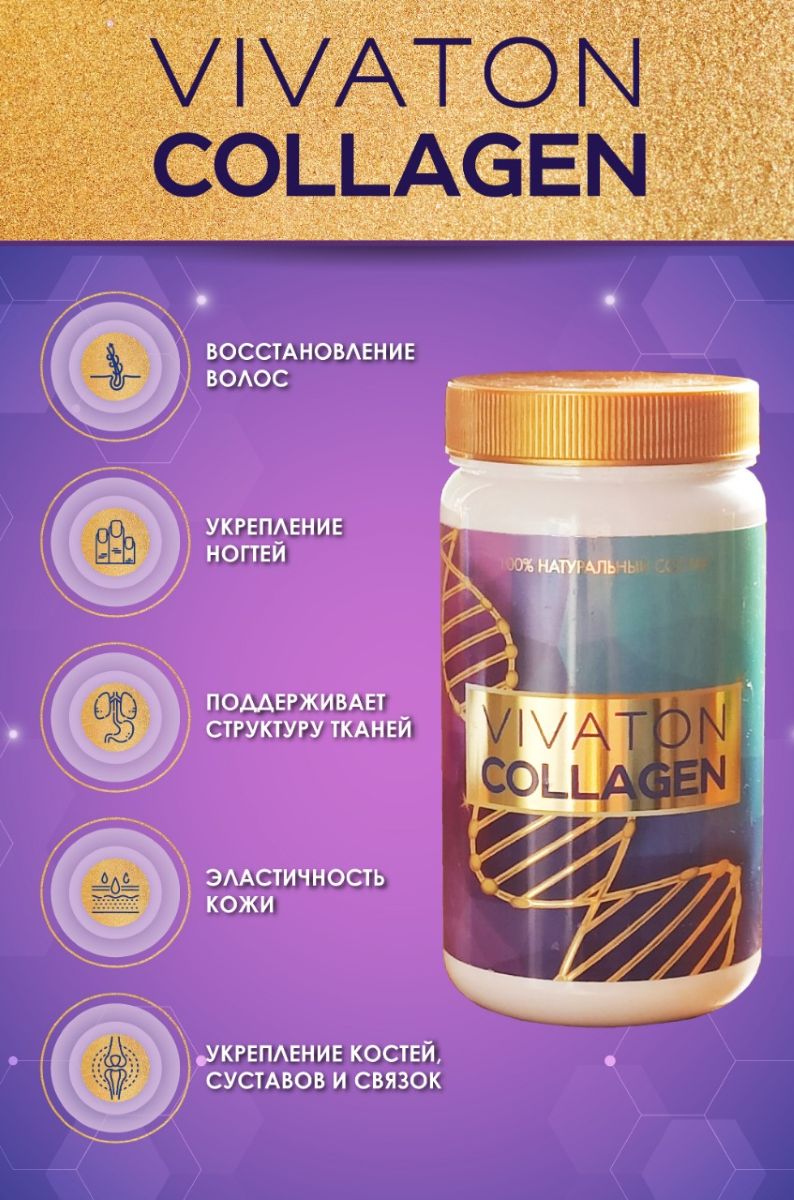 Биопрепарат «ВИВАТОН® - КОЛЛАГЕН», является природно-сбалансированным, высокоусвояемым ферментативным гидролизатом КОЛЛАГЕНА - основного белка, входящего в состав мышц, хрящей, сухожилий, связок, костей и кожи человека. Это источник свободных биологически активных низкомолекулярных полипептидов и аминокислот. Продукты расщепления физиологичны, легко проникают в клетку, являются аналогами природных продуктов желудочно-кишечного тракта. Коллаген составляет основу суставного хряща и обуславливает его прочность и эластичность.
